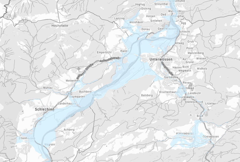 … wenn bei uns eine Extremwetterlage mit ca. 1200 m³/s Wassermenge (zum Vergleich 2013 waren es 966 m³/s) in der Ache käme, dann würde fast das ganze Achental im Wasser versinken. Lediglich Unterwössen ist durch die Hochwasserverbauung der Ache und des Wössner Baches größtenteils geschützt. Von Marquarstein abwärts bis zum Chiemsee würden praktisch alle Orte ordentlich Wasser abbekommen. Wir müssen also gar nicht nur zur Ahr schauen, auch bei uns könnte es unangenehm werden. Allerdings wäre der Ablauf deutlich sanfter. Aber schlimm wäre es trotzdem.