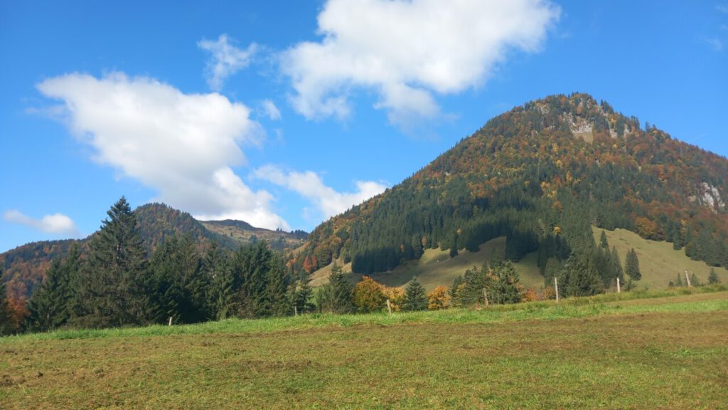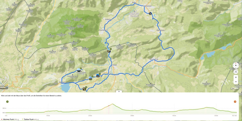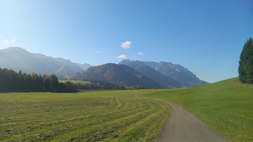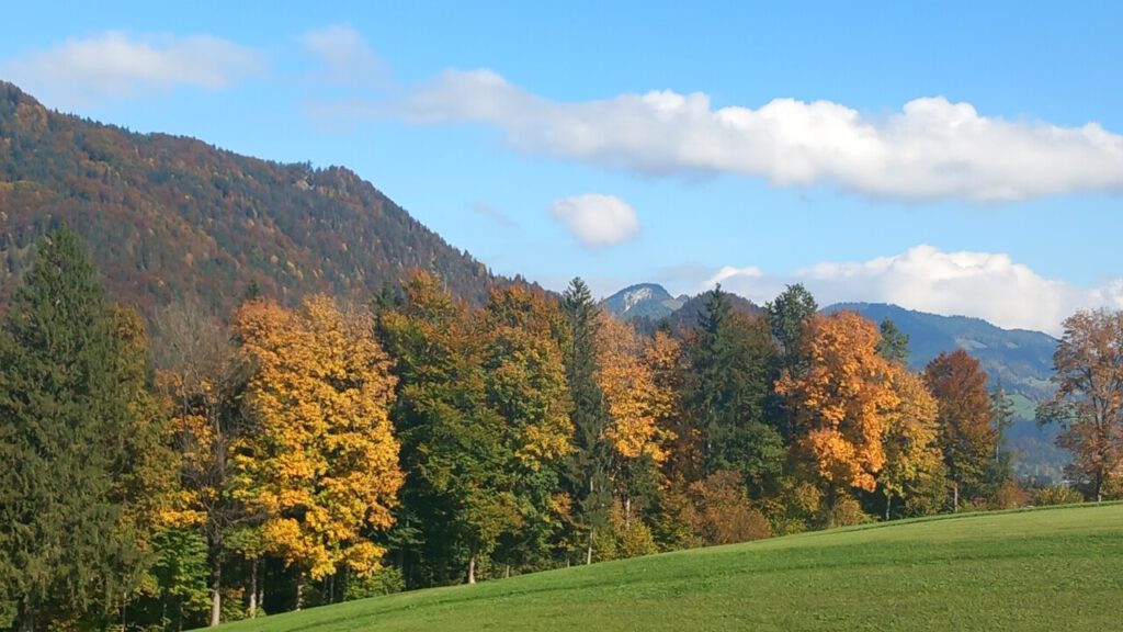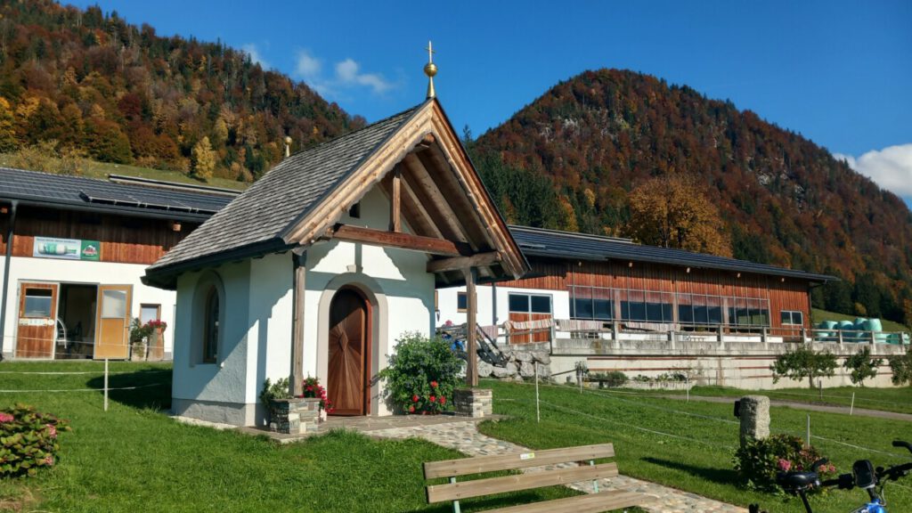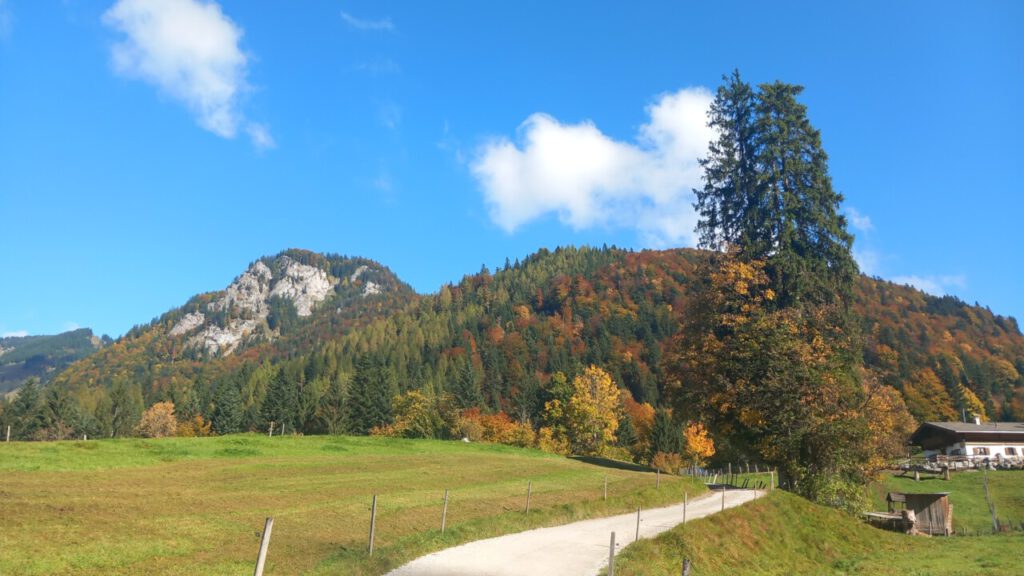 … auf die Ottenalm. Wo ich allerdings schnell wieder umgedreht bin, weil man da als Radfahrer vom Wirt nicht gern gesehen wird. Sogar das Schieben des Rades auf bestimmten Wegen, sie sind angeblich videoüberwacht, wird zur Anzeige gebracht. Radfahrer berichten, dass der Wirt schon mal gedroht hat die Reifen zu zerstechen. Irgendwie krass, habe ich so noch nirgends gesehen! Aber was soll’s, dann eben keine Einkehr beim unfreundlichen Wirt und wieder runter zum Walchsee und weiter nach Kössen. Eine wunderbare Wegstrecke, jetzt im Herbst besonders schön. Ja, und dann der Hit beim MPREIS: Sonderaktion 2 Leberkaskäsesemmeln und Apfelsaftschorle für 4,98 €, da kann man nicht meckern. Gut gestärkt, eine sonnige Bank zur Pause findet sich immer, bin ich hoch nach Reit im Winkl zu Kaffee und Kuchen beim Kotter im Rathaus. Man gönnt sich ja sonst nichts. In der Sonne sitzen mit einem Kaffee, einfach gut fürs Gemüt! Der letzte Anstieg dann zum Maserer Pass und ohne Anstrengung runter nach Hause. Alles in allem eine wunderbare, etwas längere Tagestour mit 56 km und 870 hm. Einfach dahinradeln, nichts denken und die Landschaft genießen, das war mein Plan und der hat sich voll erfüllt!