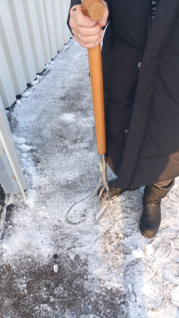 Genau das richtige Werkzeug!!Das Einzige was hilft ist heißes Wasser, sonst gar nichts!Auftauen und schaben, aber mit einem Holz und nicht mit der Grabgabel!So schaut es gut aus!Ist halt Januar am Flugplatz
