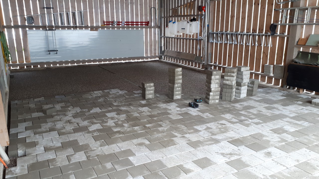 Der Hängerport wird “hochwasserfreundlich”. Heißt er soll sich leicht von Schlamm befreien lassen. Bei den letzten Hochwassern hat sich nämlich ausgerechnet im Hängerport der Schlamm extrem breit gemacht und war nur mühsam wieder raus zu bekommen. Ein solides Pflaster wird dieses Problem dauerhaft lösen. Hochdruckreiniger, schnell sauber, so ist der Plan!