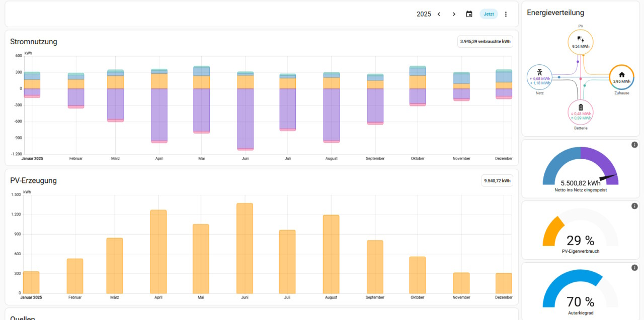 Die Werte aus dem Home Assistant zeigen, was mit einer 9,5 kWh Peak Anlage, mit 2,5 kWh Speicher und mit E-Auto etwa zustande kommt:
