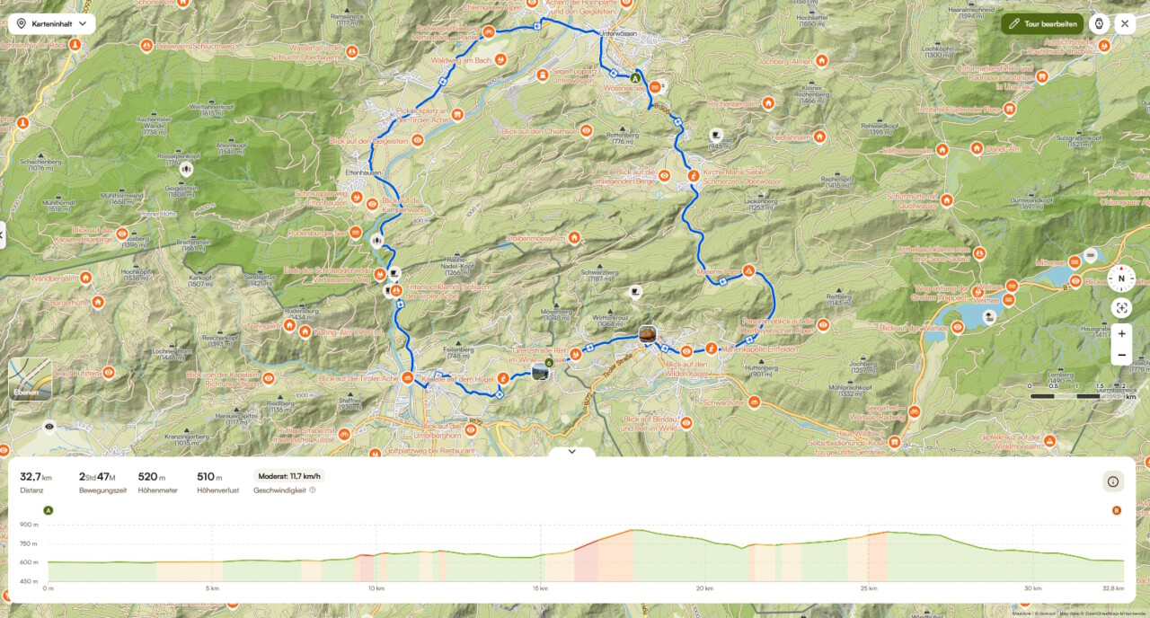 Wieder zum Radeln. Heute wollte ich mich auf die kommenden Bergfahrten zu unseren Almen etwas einfahren. Die Route entsprechend kürzer, dafür mehr Berg dabei. Und weil ich das Schütteln auf Schotter auch nicht zu viel brauche immer auf der Strasse und Radwegen. Habe auch die Geschwindigkeit reduziert und versucht mehr Watt aus den Beinen und weniger aus dem Akku zu ziehen. Meine Runde heute Kössen, hoch zum Peternhof, runter nach Reit im Winkl und wieder hoch zum Masererpass. Gesamt 32,7 km bei 520 hm. Mein Highlight heute die Kapelle vom Peterhof, die noch der Christian Mühlberger selbst gebaut hat und in der jetzt seine Urne steht. Der arme ist auch nur 76 Jahre alt geworden, er hatte noch so viele Pläne. Drum genieße ich das Radeln so lange es nocht geht und halte immer Ausschau nach einer guten Leberkässemmel, die ich heute in Reit im Winkl beim EDEKA gefunden habe, für sage und schreibe 2,40 €!